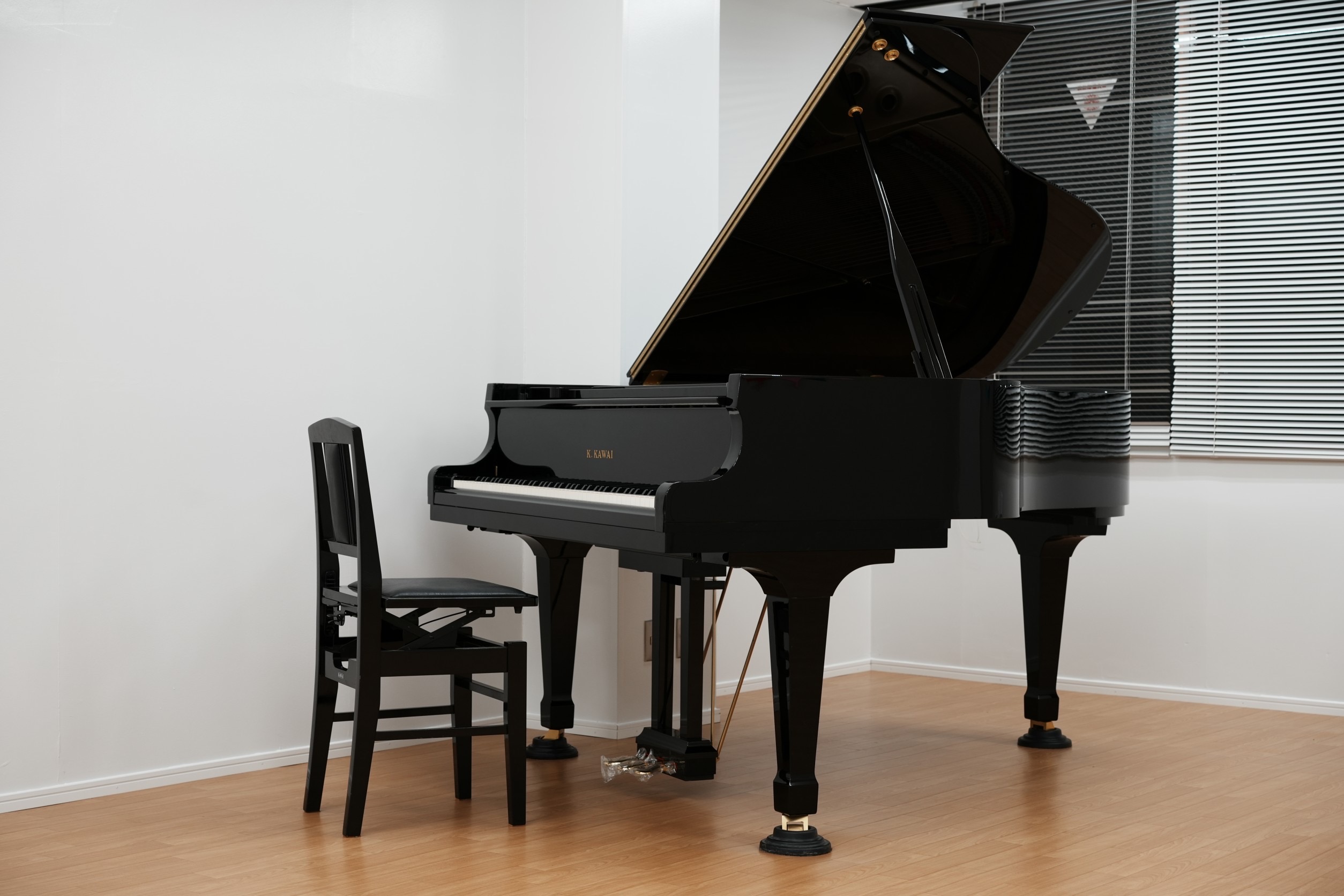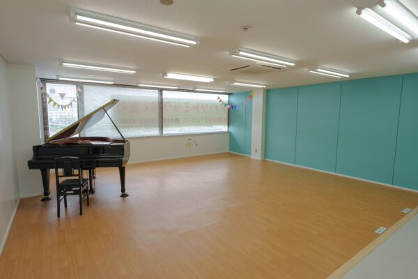 「子供たちにより良い環境と音を」の願いで、グランドピアノはKAWAI RX3限定モデル 広いレッスン室では、思いっきりリトミックができます!